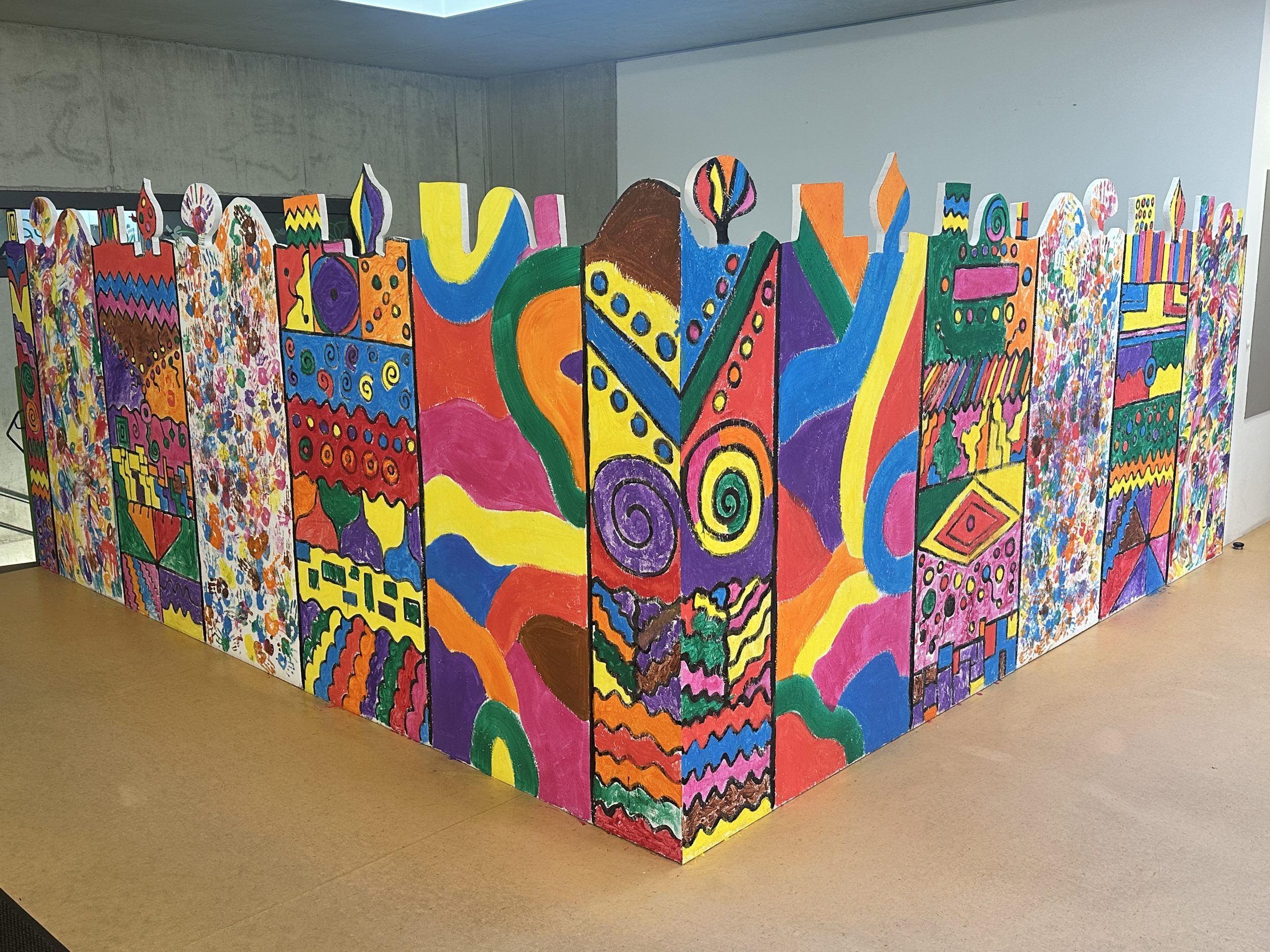 Ein Gebäude mit bunten Paneelen an der Außenseite.